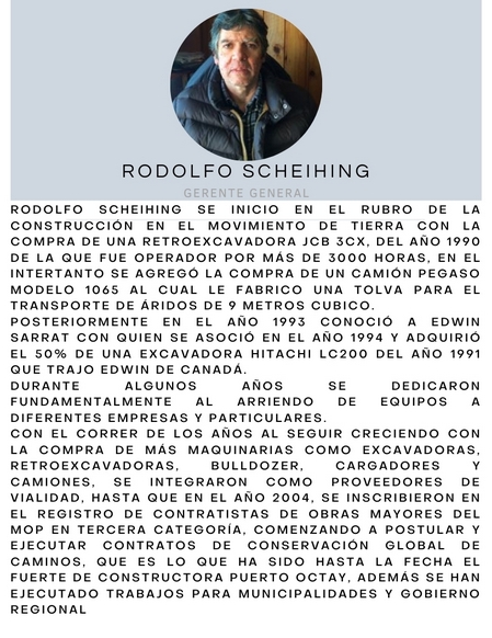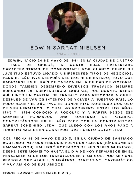 La Empresa Constructora Puerto Octay (antes Constructora Sarrat - Scheihing), comienza sus operaciones el año 2002 en la Región de Los Lagos, con la visión de constituirse en una importante Empresa Constructora, con atención personalizada de sus dueños basada en sólidos principios éticos y morales, que contribuye al desarrollo de sus trabajadores y del país.